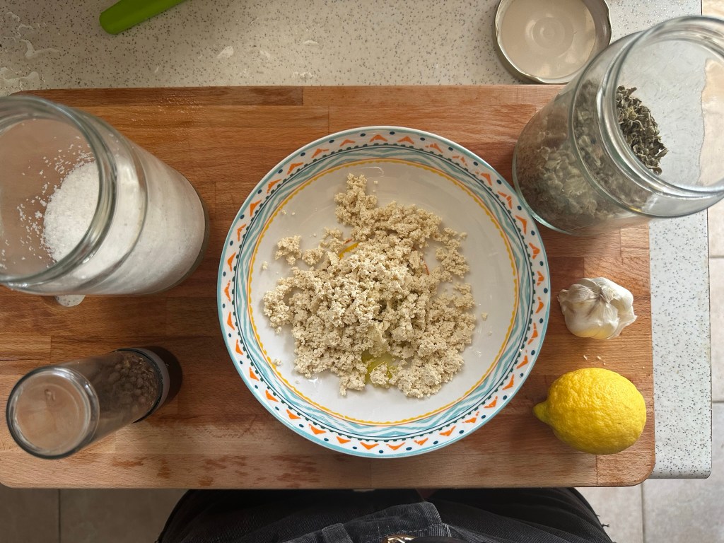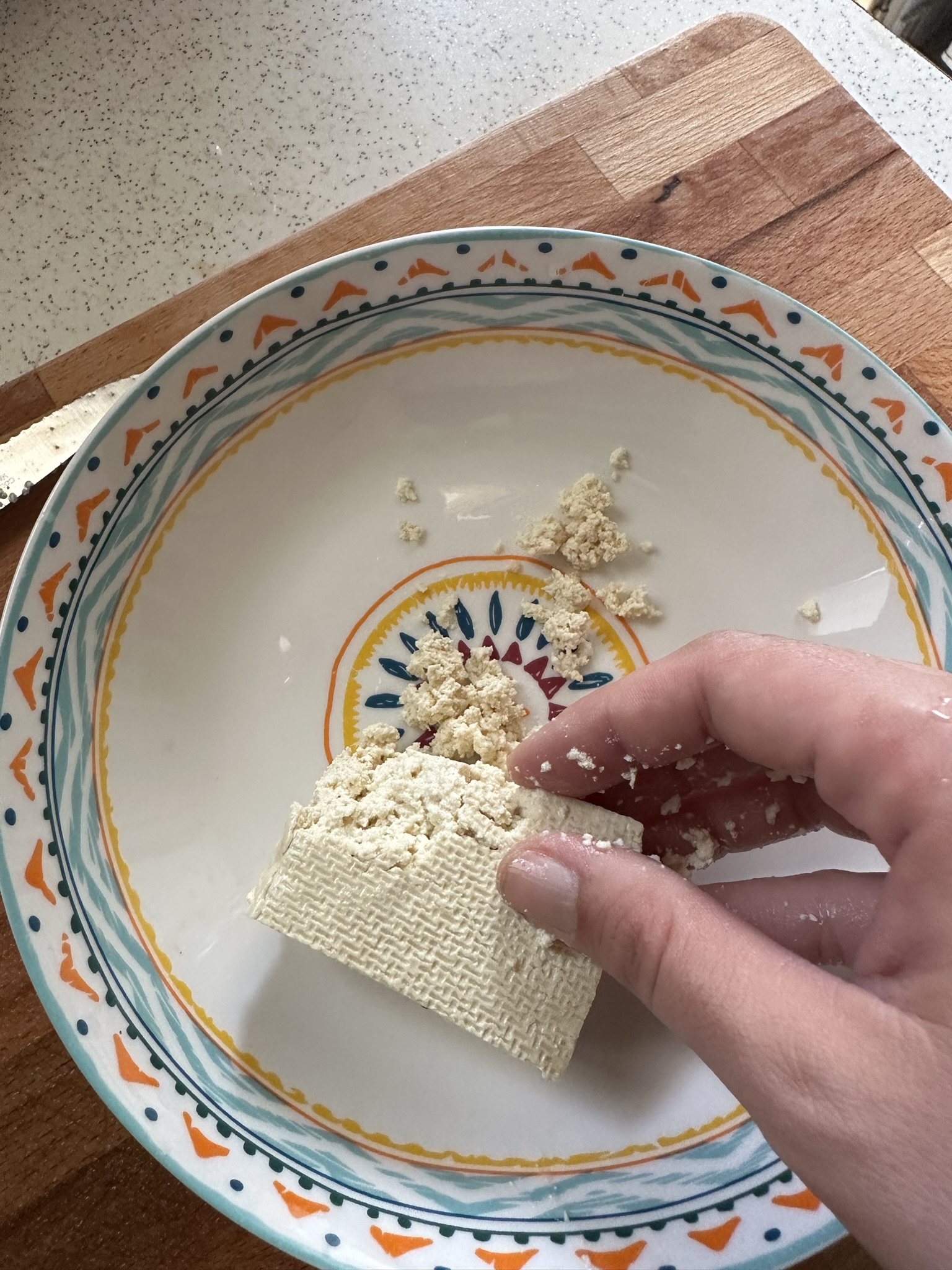 - Θρυμματίζουμε το τόφου με το χέρι μας σε ένα τάπερ ή μπολ.