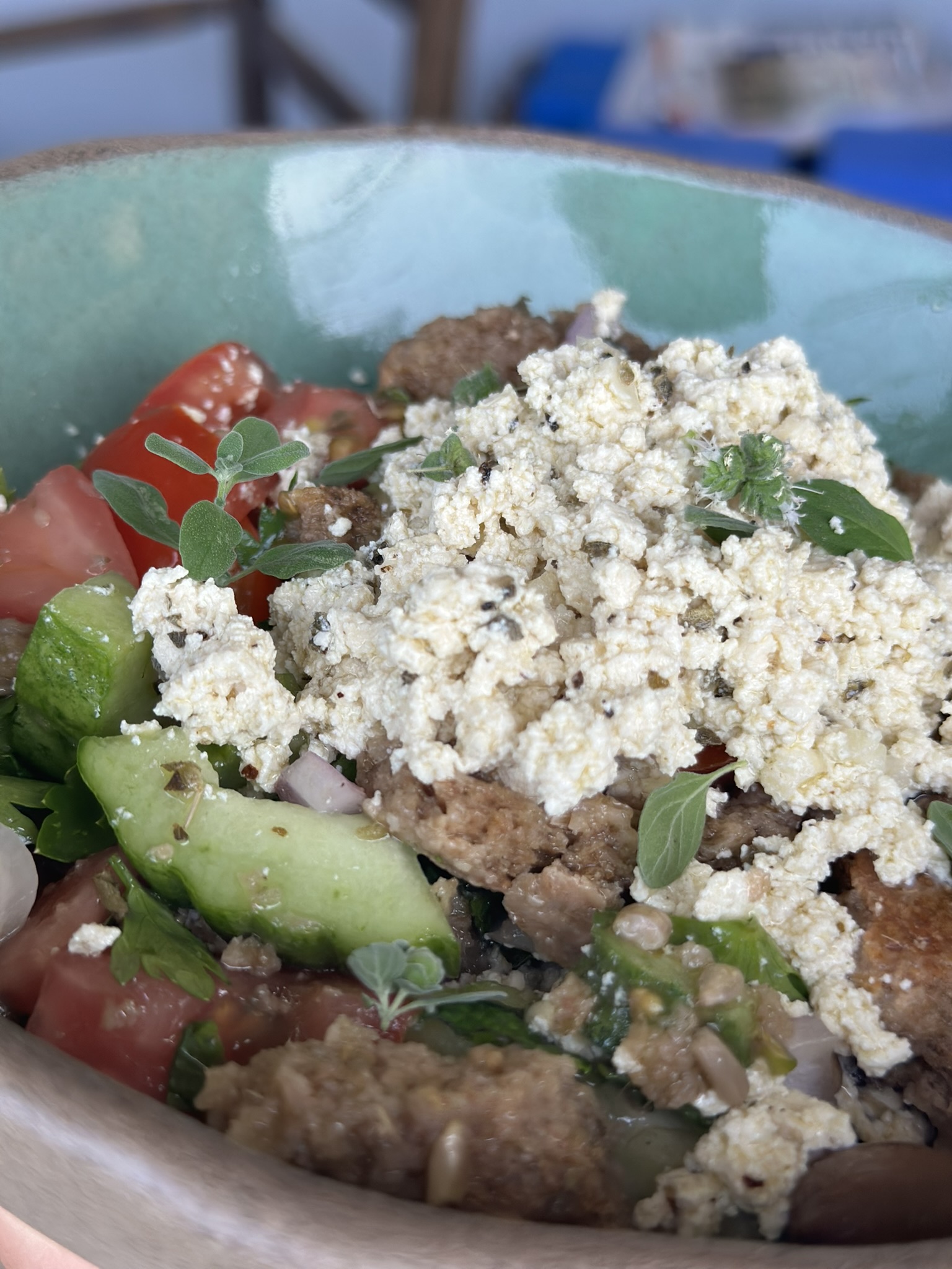 Η δική μου εκδοχή, σήμερα, είχε ντομάτες και ντοματίνια από το μπαχτσέ μου😎, ξυλάγγουρο, κρεμμύδι, ντάκο, ελιές, ηλιόσπορο, ρίγανη, ματζουράνα, μαϊντανό, ελαιόλαδο και μαριναρισμένο τόφου.